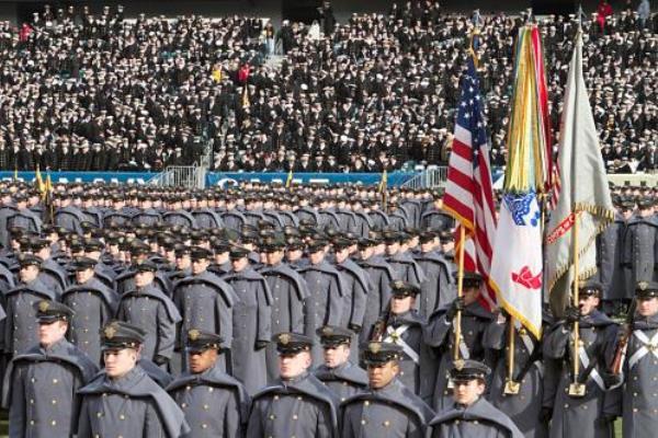 Since 1930 the game has been broadcast on the radio. Rather than stopping the game during World War II, it was played at Navy’s old Thompson Field in 1942 and at Army’s Michie Stadium in 1943. Only the players, coaches, trainers and staff members attended. However, when the Army team walked onto the field in November 1942, they found that their side had been fill with Midshipman. They had learned all of the Cadets’ cheers and fight songs, and some of the men who were there have told me that the roars for the Cadets were noticeably louder than for their own classmates. The same thing happened in reverse the following year when the Midshipmen went to West Point. They might have been Cadets or Midshipmen, but more than that they were, and are, brothers-in-arms.