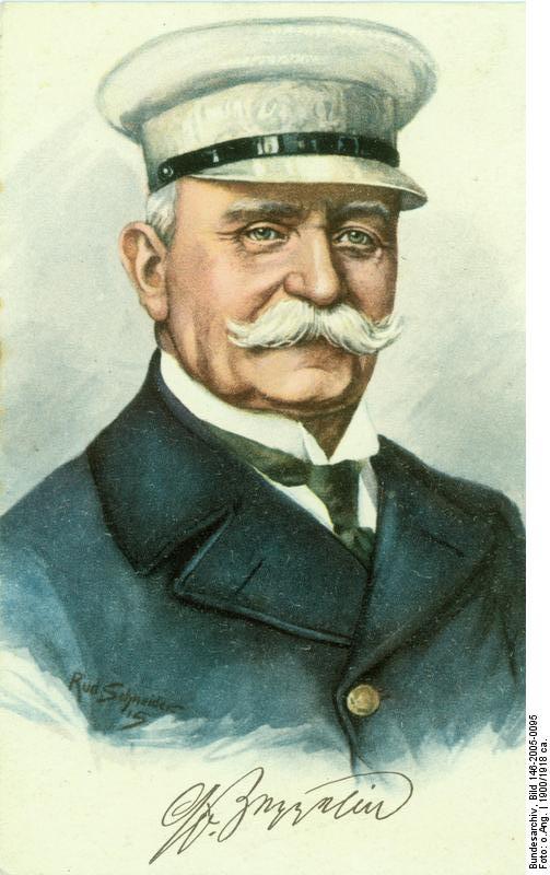 The Hindenburg, officially the LZ 129 Hindenburg, was an “airship” generally called a zeppelin. It was named after Ferdinand Graf von Zeppelin (1838-1917) who developed the lighter-than-air rigid dirigible. Born in what is now Germany, he became an Army officer in 1855, and three years later took additional training in engineering at the University of Tubingen. During the American Civil War, Zeppelin was an observed with the Union Army. After the Peninsula Campaign, he toured part of the Midwest and in August, 1863, while in St. Paul, Minnesota, he went up in a balloon for the first time. After the war, he returned to Prussia and fought in the 1866 Austro-Prussian War, and in 1870-71 served in the Franco-Prussian War. He retired from the German military in 1890, and turned his attention to developing a rigid airship.