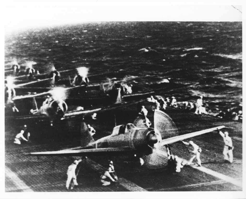 A photo of Japanese Mitsubishi dive-bombers warming up on their carrier decks getting ready to fly out to attack Pearl Harbor.