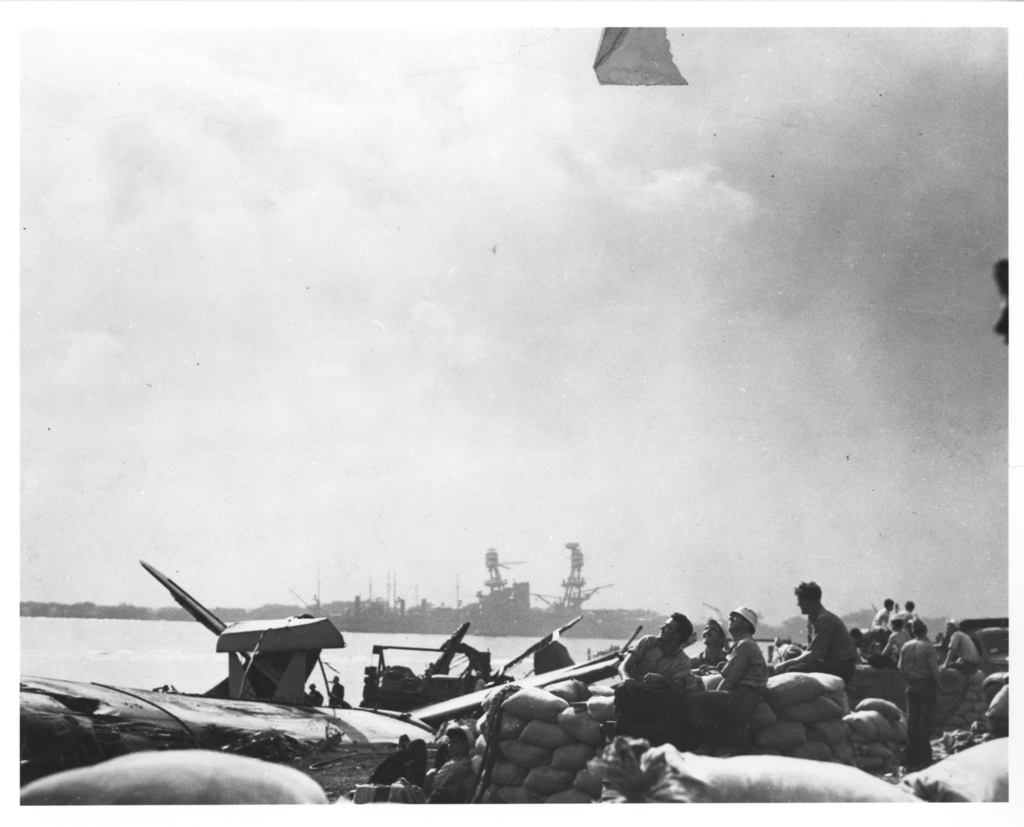 USS Arizona sinking. Whatâs left of it at that point is an inferno. To the far left, men at the stern of the USS Tennessee are hosing water down from the deck, trying to keep the burning oil away from their own ship.