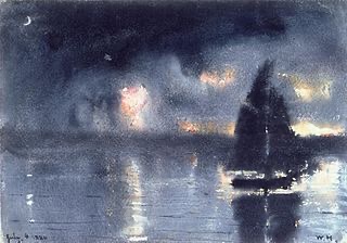 Winslow Homer painting–Sailboat and 4th of July Fireworks, 1880